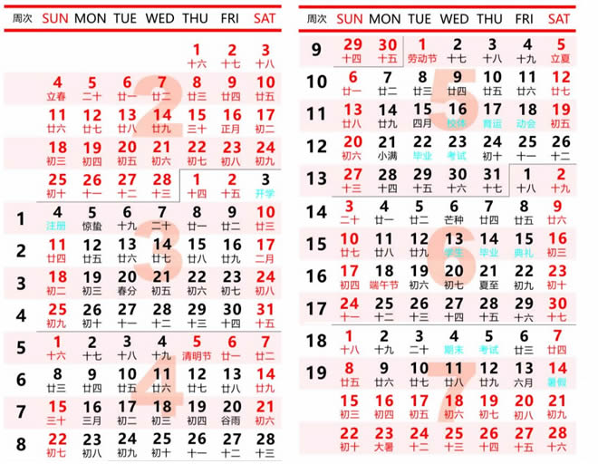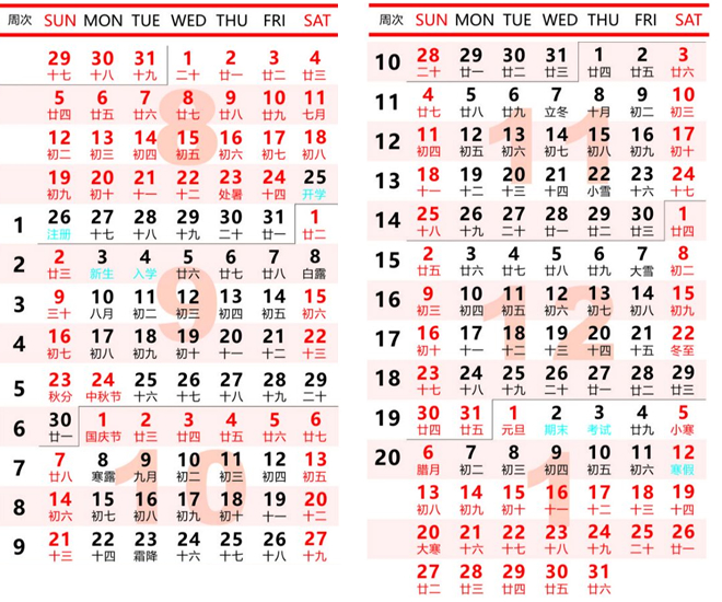 | 說明:2018—2019學年度第一學期:共20周,2018年8月25日—26日開學注冊,27日上課。2018級新生9月3日—4日入學報到,9月5日—9月18日入學教育及軍訓,9月19日上課。9月22日—24日中秋節放假,10月1日—7日國慶節放假,9月29日上第6周星期四的課程。9月30日上第6周星期五課程。2018年12月30日—2019年1月1日元旦放假。2018年12月29日上第19周星期一課程。2019年1月2日停課考試(8天)。2019年1月12日放寒假。如遇法定節假日放假安排與國務院辦公廳放假通知不一致者,以屆時國務院辦公廳放假通知為準。 | |||||