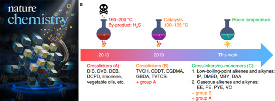 該研究團(tuán)隊(duì)在之前催化反硫化反應(yīng)的基礎(chǔ)上,針對傳統(tǒng)反硫化苛刻的高溫條件及所產(chǎn)生的一系列副反應(yīng),首次實(shí)現(xiàn)了光促進(jìn)室溫反硫化技術(shù)。該方法的亮點(diǎn):Ⅰ)非常溫和的溫度條件 (18-20 °C);Ⅱ)拓寬了交聯(lián)劑的范圍,將低沸點(diǎn)烯烴、炔烴以及更便宜和豐富的氣體交聯(lián)劑納入到反應(yīng)體系中;Ⅲ) 省去了固化步驟,縮短了反應(yīng)時(shí)間;Ⅳ)避免了有毒的 H2S 氣體副產(chǎn)物的生成,反應(yīng)過程更加綠色環(huán)保;Ⅴ)大多數(shù)情況下無需額外添加助催化劑;Ⅵ)無自膨脹效應(yīng),實(shí)驗(yàn)過程更加安全可控。