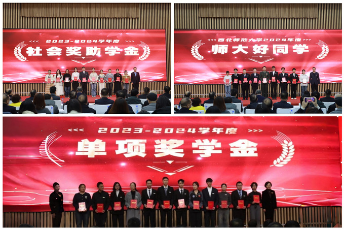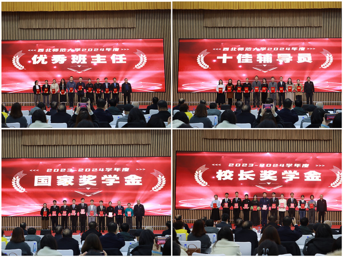 會上,賈寧為新成立機構、新增學位點授牌,并為“人才科研項目獎”獲獎代表頒獎;王占仁為“團體榮譽獎”獲得團體代表頒獎;王全進宣讀授牌機構和通報表揚、表彰獎勵名單,并為2024年度“優秀班主任”獲獎教師代表頒獎;焦愛勝為2024年度“十佳輔導員”頒獎;王文昇為2023-2024學年度“國家獎學金”本碩博獲獎學生代表頒獎;趙鑫為2023-2024學年度“校長獎學金”獲獎學生頒獎;周琳輝為2023-2024學年度“各類單項獎學金”獲獎學生代表頒獎;馬世年為2023-2024學年度“社會獎助學金”獲獎學生代表頒獎;閻巖為2024年度“師大好同學”獲獎學生代表頒獎。