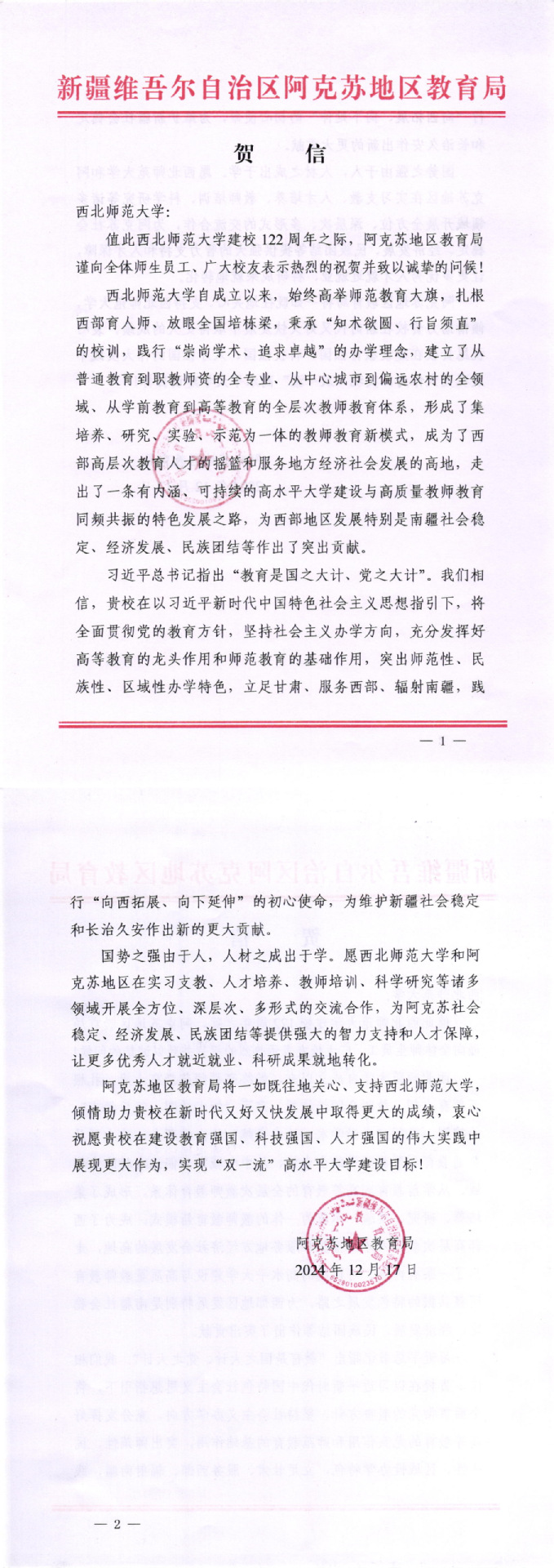 阿克蘇地區教育局向西北師大122周年校慶發來賀信
