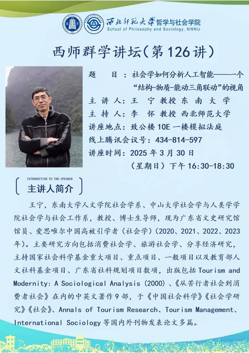 應(yīng)西北師范大學(xué)哲學(xué)與社會(huì)學(xué)院邀請(qǐng),東南大學(xué)人文學(xué)院社會(huì)學(xué)系王寧教授將來我校作學(xué)術(shù)報(bào)告。