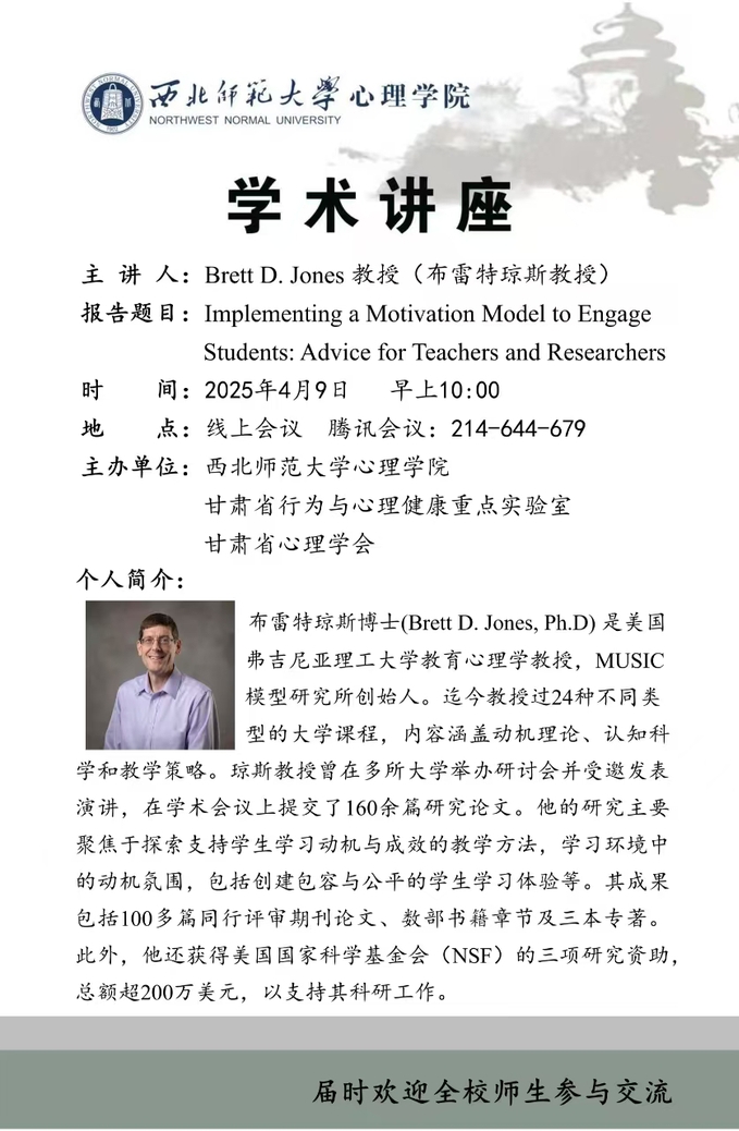 應(yīng)西北師范大學(xué)心理學(xué)院邀請,美國弗吉尼亞理工大學(xué)教育學(xué)院Brett D.Jones教授將在線為我校師生作學(xué)術(shù)報(bào)告。