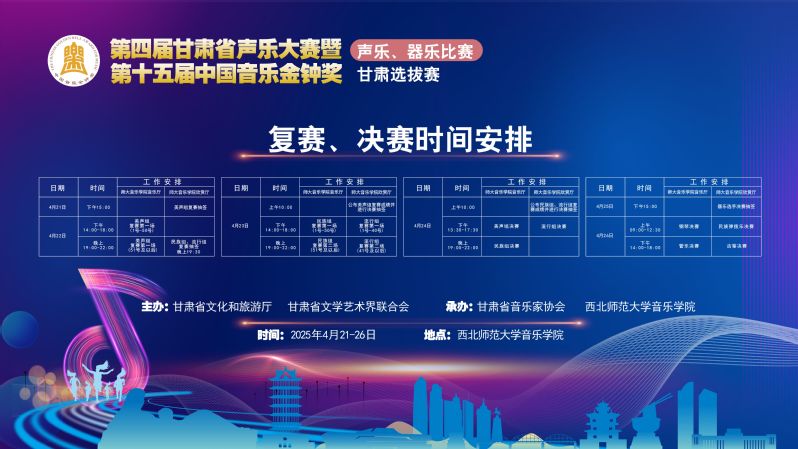 為了堅定文化自信,堅持守正創新,廣泛發掘我省優秀音樂藝術人才,推動甘肅音樂藝術事業高質量發展,由甘肅省文旅廳、甘肅省文聯共同主辦,甘肅省音樂家協會、西北師范大學音樂學院承辦的“第四屆甘肅省聲樂大賽暨第十五屆中國音樂金鐘獎聲樂、器樂比賽甘肅選拔賽復賽、決賽將于2025年4月21日至26日在西北師范大學音樂學院舉辦,歡迎廣大師生前來觀賽,共同欣賞音樂藝術的魅力!