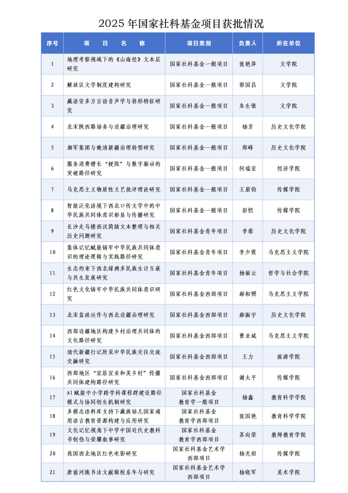 近日,國家社會科學基金年度項目、教育學項目、藝術學項目陸續公布立項結果,西北師大獲批國家社科基金各類項目共計21項。其中國家社科基金年度項目16項(一般項目8項、青年項目3項、西部項目5項)、教育學項目3項(一般項目1項、西部項目2項)、藝術學項目2項(均為西部項目)。