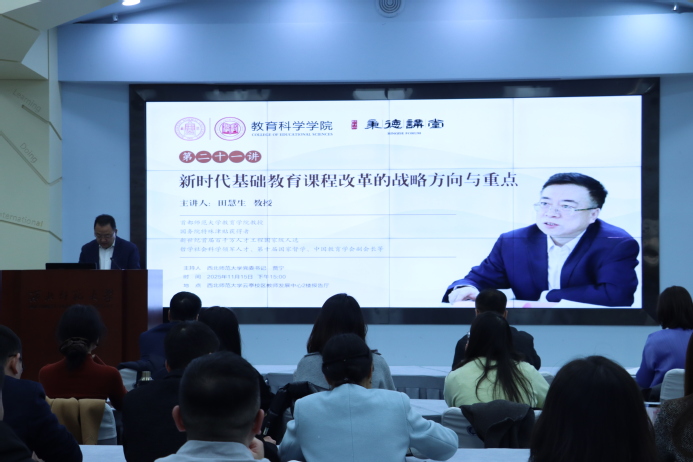 11月15日下午,“秉德講堂”第二十一講在西北師大云亭校區舉行。西北師大杰出校友、首都師范大學教育學院教授、國務院特殊津貼專家、哲學社會科學領軍人才、國家“百千萬人才工程”國家級人選、原教育部教材局局長田慧生教授作專題報告。黨委書記賈寧主持報告會并致辭。教育科學學院領導班子成員、教師代表及研究生本科生200參加。