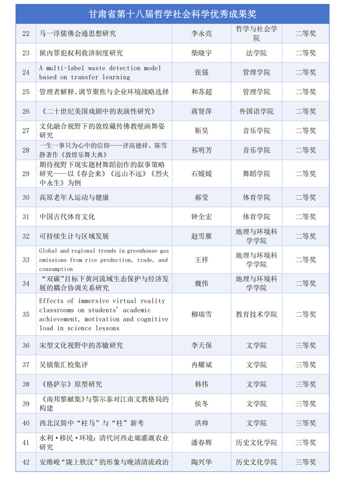 甘肅省哲學社會科學優秀成果獎和敦煌文藝獎是全省哲學社會科學和文藝領域的最高獎項。本屆共評出哲學社會科學優秀成果獎300項、敦煌文藝獎90項。近年來,學校哲學社會科學研究緊密圍繞國家戰略和區域發展需求,系統推進有組織科研,在“大平臺、大團隊、大項目、大成果”建設方面建設成效顯著,今后,學校將繼續錨定“雙一流”建設目標,強化有組織科研,推動學科交叉融合,持續推進哲學社會科學學科體系、學術體系、話語體系發展與創新,努力打造更多扎根西部的學術精品和文藝力作。