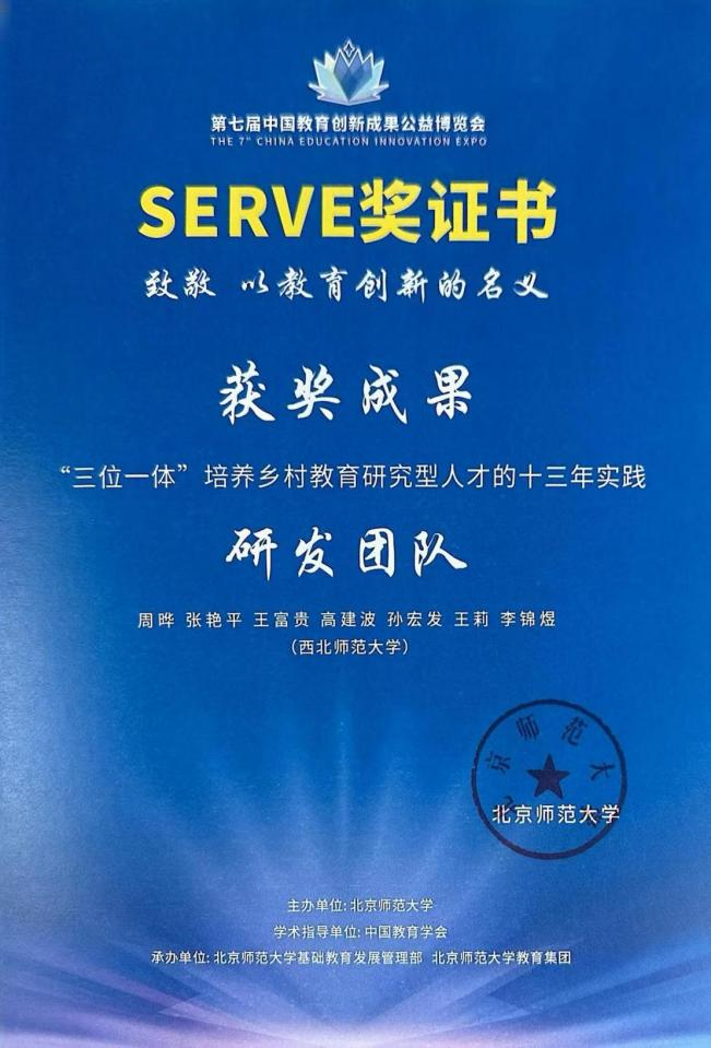 11月15日至17日,第七屆中國教育創新成果公益博覽會(教博會)在珠海國際會展中心舉行。西北師范大學教育科學學院周曄教授主持的《“三位一體”培養鄉村教育研究型人才的十三年實踐》項目榮獲本屆教博會SERVE獎,實現學校在該國家級獎項上的歷史性突破,也是甘肅省本年度唯一獲獎項目。