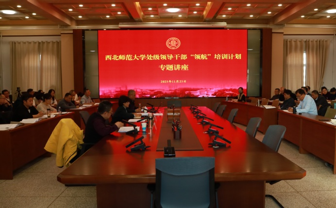 11月25日下午,西北師大舉辦第一期處級領(lǐng)導(dǎo)干部“領(lǐng)航”培訓(xùn)計(jì)劃第七場專題報(bào)告會。副校長張明軍、張金堯應(yīng)邀作專題講座,黨委常委、黨委組織部部長周琳輝主持報(bào)告會。學(xué)校處級領(lǐng)導(dǎo)干部“領(lǐng)航”培訓(xùn)計(jì)劃全體學(xué)員,教務(wù)處、研究生院、國際合作交流處全體干部參加學(xué)習(xí)。